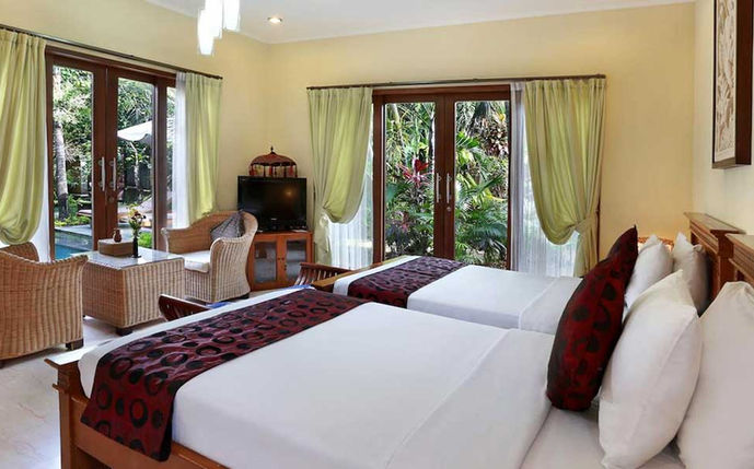 Inside, a separate bedroom and living room give you all the space you need to feel at home, while an expansive bathroom pampers you with luxurious amenities. You've got designer toiletries, an indoor shower, a deep free-standing tub and an outdoor shower with palms overhead and plants at your feet.